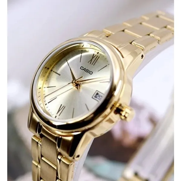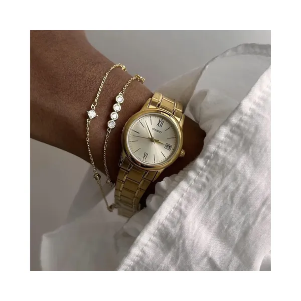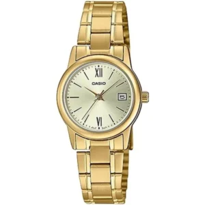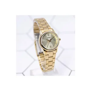 Casio LTP-V002G-9B3 női karóra klasszikus, aranyszínű megjelenéssel és megbízható japán kvarc szerkezettel. Elegáns, 25 mm-es rozsdamentes acél tokja és karcálló ásványi üvege időtálló választássá teszi a mindennapokra és alkalmi viselethez egyaránt.