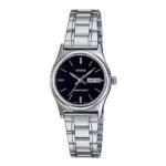 A Casio LTP-V006D-1B2 női karóra időtlen formavilágával és megbízható kvarc szerkezetével tökéletes választás a mindennapokra és elegáns alkalmakra egyaránt. A 25 mm-es, rozsdamentes acél tok és a hozzá illő, finom láncszemes karkötő fényes ezüstszíne finom kontrasztot alkot a fekete számlappal, amelyen az arabszámok és a kecses mutatók könnyen leolvashatóak.