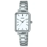 A Casio LTP-V009D-7E női karóra a letisztult eleganciát és a mindennapi strapabírást ötvözi. Keskeny, 20 mm-es, téglalap alakú nemesacél tokja és a hozzá illő, polírozott ezüstszínű csat részletei diszkréten emelik ki viselője stílusát, miközben a fehér számlap ezüst indexei kristálytiszta leolvashatóságot biztosítanak.