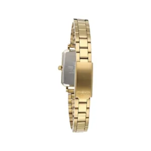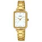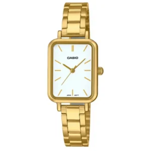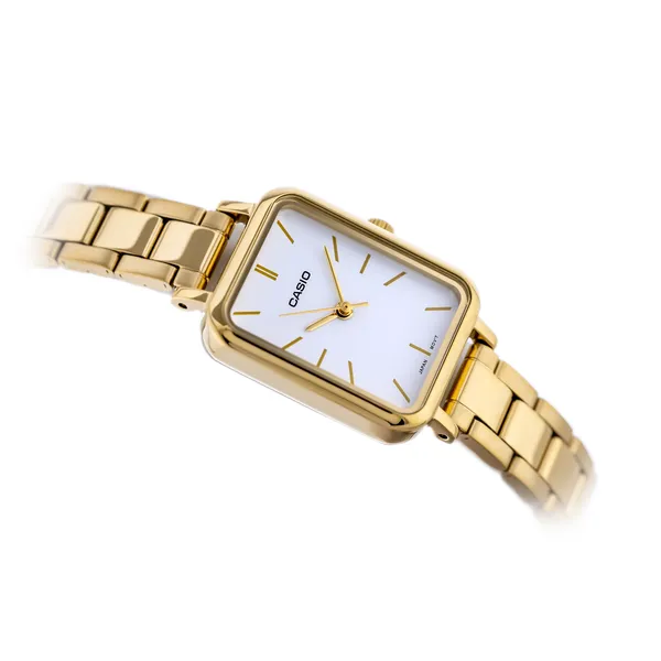 Fejezd ki kifinomult stílusodat a Casio LTP-V009G-7E aranyszínű női karórával, amely elegáns megjelenést és mindennapi megbízhatóságot kínál. A 20 mm széles, téglalap alakú, polírozott nemesacél tok és a tömör, aranyszínű nemesacél szíj diszkrét luxust sugároz, miközben a fehér számlap arany indexei könnyen olvashatóvá teszik az időt.