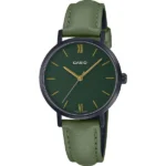 Az elegáns Casio LTP-VT02BL-3A női karóra a japán kvarc szerkezet pontosságát ötvözi a letisztult dizájnnal. A fekete, rozsdamentes acél tok és a zöld, valódi bőrszíj karakteres, mégis sokoldalú megjelenést kölcsönöz, így a modell hétköznapi viselethez és alkalmi ruhákhoz egyaránt illik. A karcálló ásványi üveg alatt elhelyezkedő zöld számlap függőleges indexei tiszta, gyors időleolvasást biztosítanak.