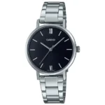 A Casio LTP-VT02D-1A női karóra letisztult, minimalista stílusával és fekete számlapjával elegáns kiegészítője a mindennapoknak és az alkalmi megjelenésnek.