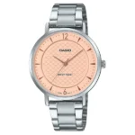 A Casio LTP-VT04D-4A női karóra letisztult, minimalista megjelenésével könnyedén emeli bármely öltözet eleganciáját. A fényes, rozsdamentes acél 35 mm-es tok és a hozzá illő, könnyen méretre állítható ezüst színű szíj a mindennapokban is kényelmes viseletet biztosít. A pasztellrózsaszín számlap aranyszínű mutatókkal és indexekkel párosul, így a pontos idő egy pillantással leolvasható.