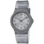 A Casio MQ-24S-8BEF női karóra a letisztult dizájn és a mindennapi kényelem tökéletes ötvözete. Könnyű, szürke műanyag tokja és pántja alig érezhető a csuklón, miközben a 36 mm-es, kerek forma nőies megjelenést kölcsönöz. Az ezüstszínű számlapon fehér indexek és karcsú mutatók biztosítják a kiváló leolvashatóságot, felesleges díszítés nélkül.