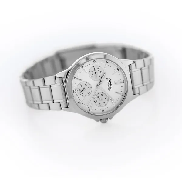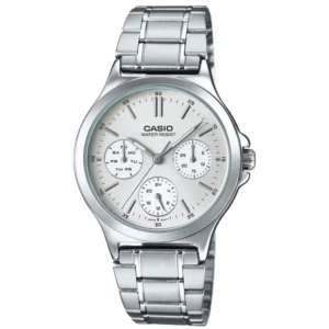 Válaszd a Casio LTP-V300D-7A női karórát, ha egy időtálló, elegáns kiegészítőt keresel, amely minden alkalomhoz illik. Az ezüstszínű, 33 mm-es nemesacél tok és a harmonizáló acél szíj kifinomult megjelenést kölcsönöz, míg a letisztult, ezüst számlap jól olvasható indexeivel és vékony mutatóival ragyogóan mutat nappali és esti fényben egyaránt.