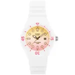 A Casio LRW-200H-4E2V női karóra vidám színeivel és kis méretével ideális első időmérő fiatal lányoknak. A fehér, puha műanyag szíj kényelmes viseletet ad, a 33 mm-es, könnyű tok pedig nem terheli a csuklót. Analóg számlapján nagyméretű, rózsaszín–sárga indexek segítik a gyors leolvasást, a forgatható lünetta pedig játékos, mégis hasznos kiegészítő.