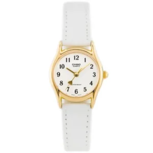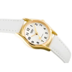 A Casio LTP-1094Q-7B5 női karóra elegáns fehér bőrszíjjal és aranyszínű rozsdamentes acél tokkal készül, így mindennapi viselethez és alkalmi megjelenéshez is kifinomult választás. A letisztult, fehér számlapon jól látható indexek segítik a gyors időleolvasást, a megbízható kvarc szerkezet pedig pontos működést garantál.
