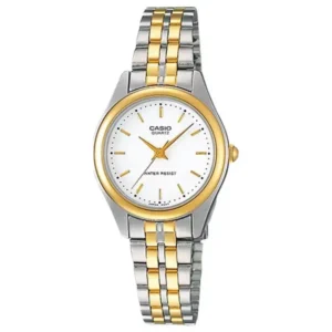A Casio LTP-1129G-7A női karóra a klasszikus, letisztult stílust ötvözi a modern technológiával. A kétszínű (ezüst-arany) rozsdamentes acél tok és bruszolt-polírozott csuklópánt finoman keretezi a hófehér számlapot, arany tónusú indexekkel és mutatókkal. A Miyota kvarc szerkezet pontos időt mutat, míg az analóg dátumkijelző praktikus segítség a mindennapokban.