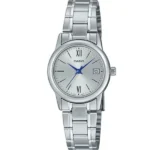 LTP-V002D-7B3UDF modell a Casio letisztult, nőies stílusát hozza el: kompakt, 25 mm-es nemesacél tok és harmonizáló, ezüst színű számlap fekete indexekkel gondoskodik a kifinomult megjelenésről.
