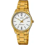 A Casio LTP-V005G-7B női karórát úgy tervezték, hogy minimalista stílusa mellett mindennapos megbízhatóságot biztosítson. A hófehér számlap és a finom arany mutatók, indexek elegáns kontrasztot alkotnak, így a karóra bármilyen öltözéket könnyedén kiegészít.
