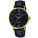 Az elegáns Casio LTP-VT01GL-1B női karóra a japán precizitás és a klasszikus dizájn tökéletes egyensúlyát kínálja. A 34 mm-es, polírozott aranyszínű acéltok finoman keretezi a minimalista, fekete számlapot, amelyről a függőlegesen elhelyezett indexek és jól olvasható arab számok pillanatok alatt leolvashatók.