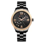 Az elegáns fekete-rózsaarany karóra cirkóniás számlapjával azonnal magára vonja a tekintetet, míg tartós kvarc szerkezete és karcálló ásványi üvege megbízható mindennapi társ. Díszdobozban érkezik, így azonnal átadható stílusos ajándékként.