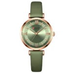 A Curren 9079 női karóra elegáns kiegészítő, amely egyesíti a modern designt és a praktikus mindennapi használatot. Az olívazöld számlapot és a rózsaarany indexeket karcálló ásványi üveg védi, míg a vékony, valódi bőrből készült szíj kényelmes viseletet biztosít akár munkahelyen, akár hétvégi programokon.