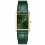 A 22 mm-es rózsaarany tok és a krokodilmintás zöld bőrszíj kecsesen öleli körbe a csuklót, míg a precíz japán kvarc szerkezet és a 30 m vízállóság gondoskodik a mindennapi megbízhatóságról.