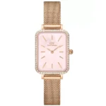 A Daniel Wellington Quadro Lumine Bezel Melrose Pink DW00100669 női karóra minimalista, mégis látványos kiegészítő, amely a skandináv letisztultságot finom csillogással ötvözi. A 20 × 26 mm-es, mindössze 6 mm vastag téglalap alakú tokot cirkónia kristályok szegélyezik, míg a gyöngyház-rózsaszín számlap diszkrét pontindexeket kapott.