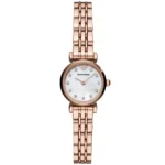 Az Emporio Armani Gianni T-Bar AR11203 női karóra tökéletes kiegészítő az üzleti meetingektől a romantikus vacsorákig. A karcsú, 22 mm-es, rózsaarany színű nemesacél tok gyöngyházfényű fehér számlapot fog közre, melyet csillogó cirkóniák és letisztult pont indexek tesznek ragyogóvá. A vékony, 10 mm-es acél szíj könnyed viseletet biztosít, a megbízható kvarc szerkezet pedig gondoskodik a másodpercre pontos időről.