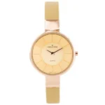 Bézs bőr szíjjal és rozéarany tokkal készült női karóra, amelyet precíz japán kvarc szerkezet és antiallergén bevonat tesz igazán megbízhatóvá; karcsú formája és WR30 védelme kényelmes, mégis elegáns viseletet biztosít.