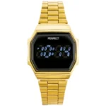 Az elegáns aranyszínű, digitális LED karóra gyors idő- és dátumleolvasást, antiallergén IPS bevonatot és WR30 fröccsenésálló védelmet kínál. Karcsú téglalap kijelzője és könnyen állítható fém szíja stílusos, kényelmes társ a mindennapokhoz, és bármilyen öltözékhez illik, legyen szó munkáról vagy esti programról.