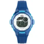 WR100 vízállóságú digitális karóra, amely a kronográf, ébresztő és háttérvilágítás funkcióival sportoláskor és hétköznap is pontosan követi idődet. Tartós kvarc szerkezete, karcálló ásványi üvege és kényelmes kék műanyag szíja gondtalan viselést biztosít.