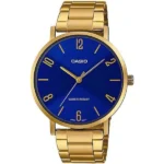 A Casio Collection LTP-VT01G-2B női karóra letisztult vonalaival és ragyogó, aranyszínű rozsdamentes acél tokjával azonnal elegáns fényt kölcsönöz viselőjének. A sötétkék számlap vékony arany mutatókkal harmonizál, az ásványi üveg pedig megvédi a felületet a karcoktól, hogy hosszú ideig hibátlan maradjon.