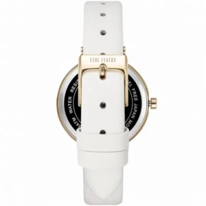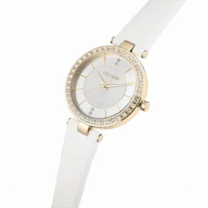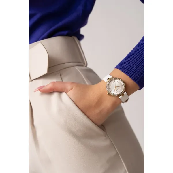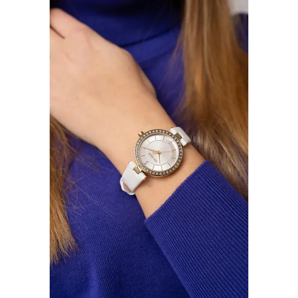 A cirkóniákkal ragyogó aranytok és az ezüst számlap azonnal luxus fényt kölcsönöz a csuklónak. A pontos japán Miyota szerkezet, a fehér valódi bőrszíj és az ajándék díszdoboz gondoskodik a tartós, stílusos és ajándéknak is tökéletes élményről.