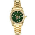 Pazar aranyszínű, rozsdamentes acél női karóra zöld, cirkóniákkal díszített számlappal és megbízható kvarc szerkezettel; karcsú kialakítása és 3 ATM vízállósága kényelmes, mégis látványos kiegészítővé teszi, amely ajándék díszdobozban, 24 hónap garanciával érkezik.