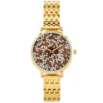 A japán Miyota szerkezetű, aranyszínű női karóra csillogó narancs-ezüst számlapjával és karcálló mineralüvegével megbízható, mégis látványos kiegészítő. Vékony 36 mm-es tokja, antiallergén bevonata, WR30 vízállósága és állítható fém karkötője kényelmes viseletet biztosít a mindennapokra és különleges alkalmakra is, tökéletesen illeszkedik, és egész nap komfortot nyújt.
