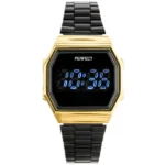 A női LED kijelzőjű karóra letisztult fekete-arany megjelenése és fröccsenésálló kialakítása elegáns, mégis praktikus társ a hétköznapokban. Digitális kijelzője egyszerre mutatja az időt és a dátumot, a nikkelmentes IPS bevonat pedig kíméli az érzékeny bőrt.