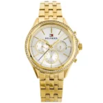 A Tommy Hilfiger Ari (1781977) női karóra letisztult, mégis lenyűgöző ékszer-kiegészítő, amely aranyszínű nemesacél tokjának és cirkóniaköves lünettájának köszönhetően elegánsan ragyog a csuklón. 38 mm-es, kerek tokja kényelmes viseletet, a csiszolt mineralüveg pedig biztonságot nyújt a karcolásokkal szemben.