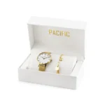 Az elegáns ajándékszett precíz japán MIYOTA szerkezetű aranyszínű női karórát és hozzá illő karkötőt kínál, amely antiallergén bevonatának köszönhetően bőrbarát. Állítható fémszíjával és WR30 vízállóságával minden nap stílusos, mégis gondtalan viselést biztosít.