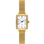 Az elegáns Perfect F112-02 női karóra a mindennapok és alkalmi viseletek kifinomult kiegészítője. A 34 mm-es, téglalap alakú, aranyszínű tok és a hozzá illő fémszíj letisztult fehér számlappal párosul, amelyen a fekete indexek kiválóan olvashatók. A megbízható japán Miyota kvarc szerkezet pontos időmérést biztosít, míg a karcálló ásványi üveg és a WR30 fröccsenés-álló vízállóság gondtalan használatot tesz lehetővé.