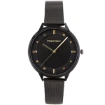 A Perfect F369-05 női karóra elegáns, mindennapi és alkalmi viselethez is passzoló darab. A 35 mm-es, kerek, fekete tokot karcálló ásványi üveg védi, belül pedig a megbízható, japán Miyota kvarc szerkezet gondoskodik a pontos időről. A finoman fénylő, fekete fémszíj állítható csattal kb. 4,5 cm tartományban szabható csuklóra.