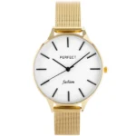 Elegáns, aranyszínű Perfect női karóra, amely ötvözi a letisztult dizájnt és a megbízható japán Miyota kvarc szerkezet pontosságát.