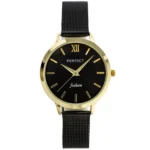 Élvezze a stílus és pontosság harmóniáját a Perfect F202-10 női karórával. A japán Miyota kvarc szerkezet megbízható időmérést biztosít, míg az elegáns fekete számlap és az arany színű, 35 mm-es kerek tok kifinomult megjelenést kölcsönöz. A fémből készült, 15 mm széles fekete szíj kényelmes viseletet nyújt a mindennapokban és különleges alkalmakon egyaránt.