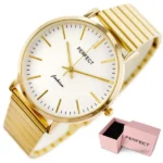 Elegáns arany-ezüst színösszeállítású női karóra a Perfect márkától, amely időtlen kiegészítője lehet mindennapi és alkalmibb viseletednek. Japánban készült megbízható kvarc szerkezete pontos időmérést garantál, a karcálló ásványi üveg pedig óvja a 34 mm-es ezüstszínű számlapot.