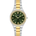 Finoman csillogó, kétszínű tokkal és zöld számlappal készült női karóra, amely a japán Miyota kvarc szerkezetnek köszönhetően mindig pontos és megbízható. Karcsú, 34 mm-es kialakítása, kristályköves díszítése és ajándék díszdoboza ideális választássá teszi a mindennapokra vagy különleges alkalmakra.