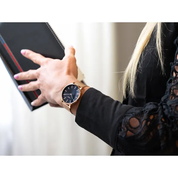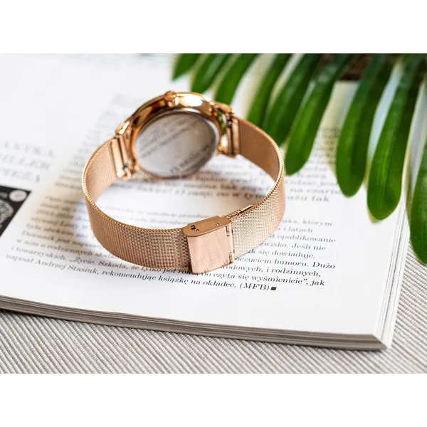 Stílusos rózsaarany tok és hálós szíj találkozik pontos japán kvarc szerkezettel és 5 bar vízállósággal, így ez a karóra elegánsan kísér a munkahelytől a koktélestig. A vékony, mindössze 7 mm-es tok és a polírozható ásványi üveg kényelmes hordást és hosszú élettartamot biztosít.