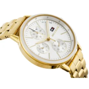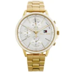 Merülj el a Tommy Hilfiger Carly 1781786 női karóra kifinomult eleganciájában, amely az aranyszínű nemesacél tokot és szíjat ezüst számlappal ötvözi. A divatos design mellett megbízható kvarc szerkezete pontos időmérést, az ásványi üveg pedig fokozott karcállóságot biztosít.
