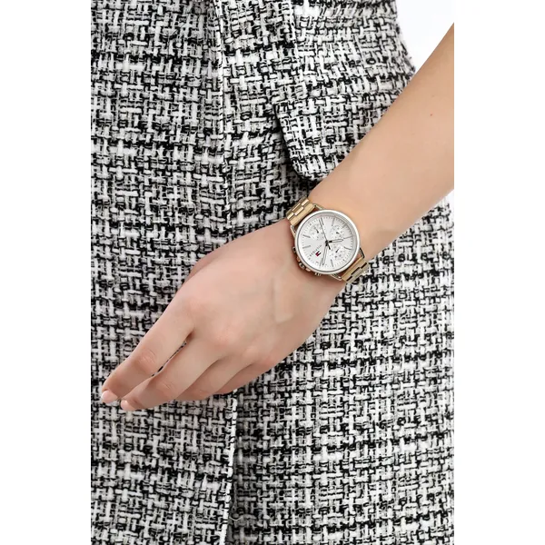 Elegáns, aranyszínű nemesacél női karóra ezüst számlappal, mely precíz kvarc szerkezettel és ásványi üveggel gondoskodik a megbízható működésről. A 24 órás, dátum- és második időzóna kijelzés segítségével minden pillanatban naprakész maradhatsz.