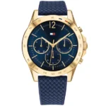 Az aranyszínű rozsdamentes acél tok és a mélykék szilikon szíj különleges kontrasztot alkot, így a Tommy Hilfiger Haven 1782198 női karóra elegáns és sportos megjelenést biztosít a hétköznapokban és az ünnepi alkalmakon egyaránt. A 40 mm-es, mindössze 8 mm vastag tok alatt megbízható kvarc szerkezet gondoskodik a pontos időről, míg a karcálló, edzett ásványi üveg megóvja a számlapot.