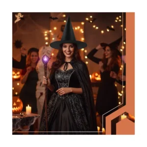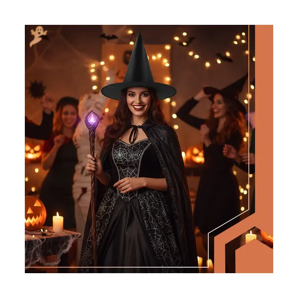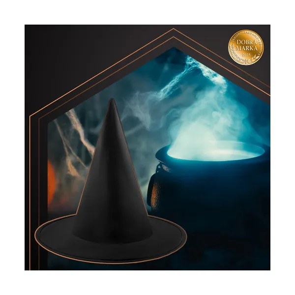 Hódítsd meg az éjszakát ezzel a klasszikus, mélyfekete boszorkánykalappal, amely minden jelmeznek misztikus karaktert kölcsönöz. Könnyű poliészter anyagból készült, merev karimával és hegyes, kúpos koronával, így egész estére kényelmes viselet.