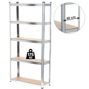 Rendezze szerszámait, dobozait vagy háztartási kellékeit ezen az erős, 5 szintes állványon! Horganyzott acél profiljai ellenállnak a korróziónak, míg a 18 mm vastag MDF polcok polconként akár 175 kg terhet is elbírnak egyenletes terhelés mellett. A csavarmentes, bepattintható rendszer miatt az összeszerelés gyors és egyszerű, a polcok magassága pedig szabadon állítható, így a polcrendszer tökéletesen alkalmazkodik a tárolandó tárgyakhoz.