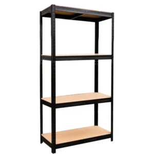 A masszív, négy szintes állvány fekete, porfestett acélváza és MDF polclapjai akár 150 kg teher/polc terhelhetőséget biztosítanak, így ideális szerszámok, dobozok, élelmiszer-tartalékok vagy háztartási cikkek rendezett tárolására garázsban, műhelyben vagy raktárban. A polcok 30 cm mélyek, 70 cm szélesek és 150 cm magasak, így kis alapterületen is hatékonyan használhatók.