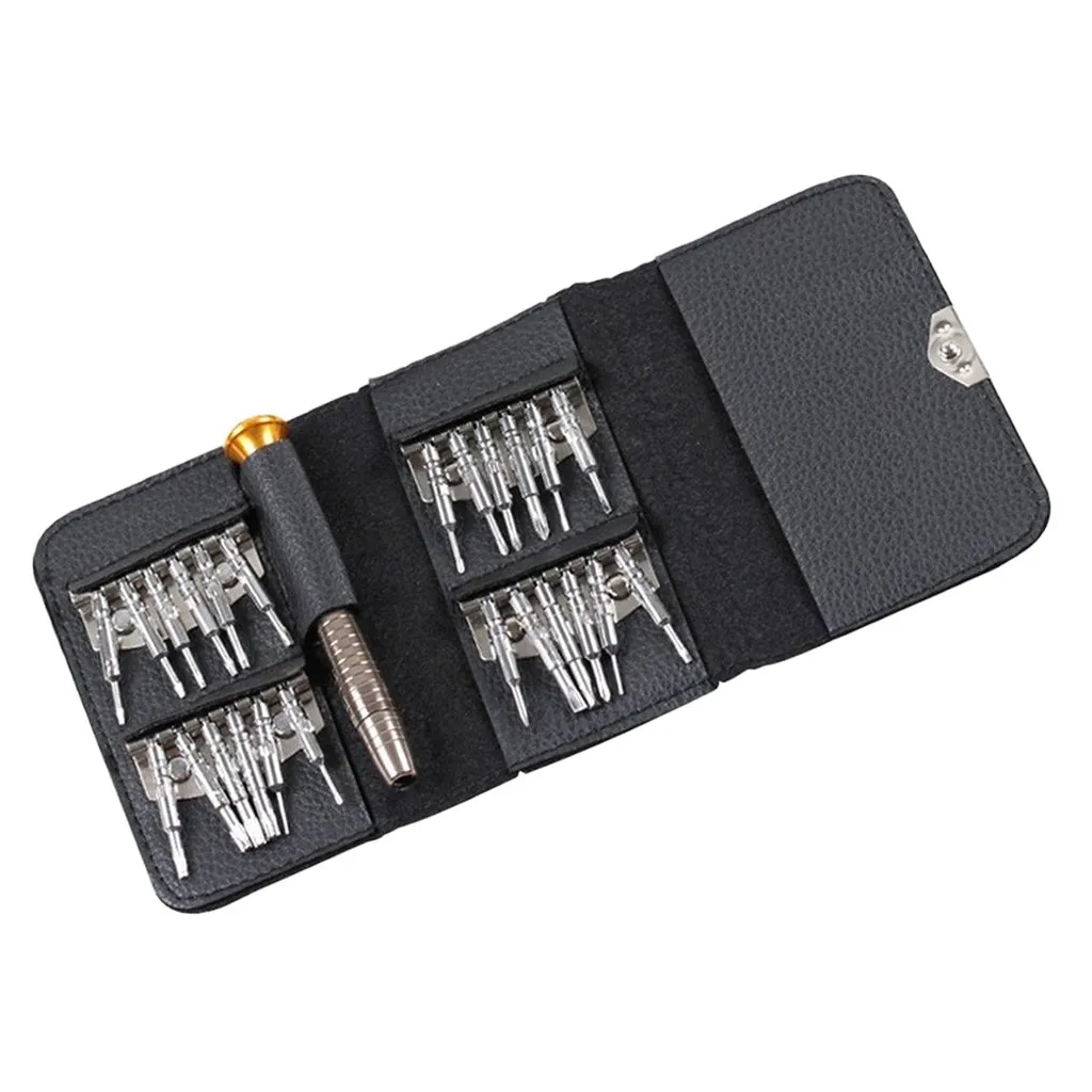 A készlet 24 precíziós bitet és kontúros, kényelmes markolatot tartalmaz. A csavarhúzók egy elegáns és praktikus tokban vannak csomagolva, amely úgy néz ki, mint egy pénztárca.