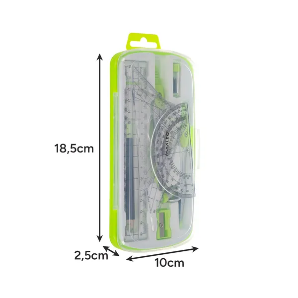 Maaleo 10 darabos iskolai geometriai készlet tokban, körző, vonalzó, szögmérő