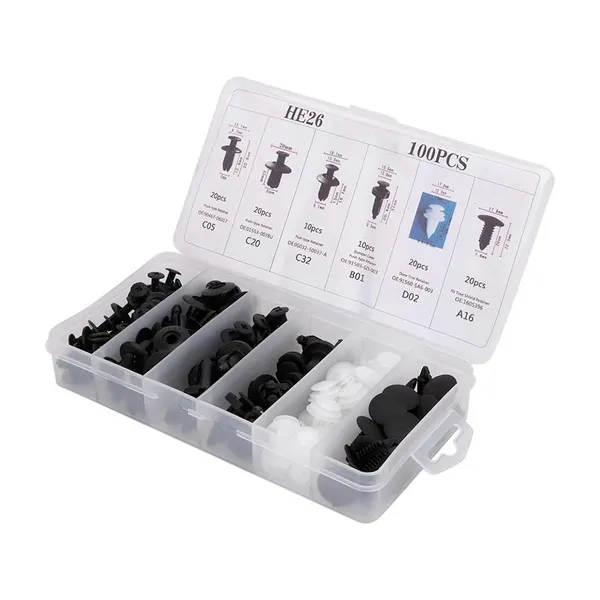 100 darabos műanyag patent készlet, amely kárpitok, lökhárítók, sárvédők és más belső-külső elemek gyors, sérülésmentes rögzítésére alkalmas, így további időt és pénzt spórolsz a mindennapi szervizelésen. A rekeszes, átlátszó doboz megkönnyíti a gyors rendszerezést és a megfelelő méret azonnali megtalálását.