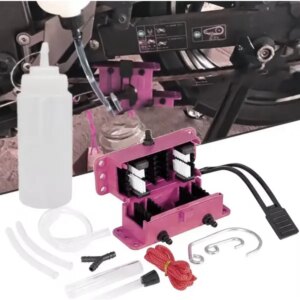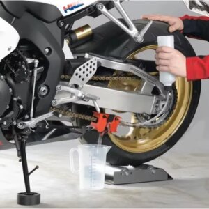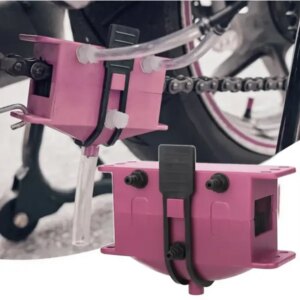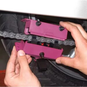 • Motorkerékpár lánc tisztító és kenő készlet. Átgondolt kialakítása jelentősen megkönnyíti a jármű karbantartását. Az eszköz jelentősen növeli a hajtásrendszer élettartamát, megkönnyítve annak tisztítását és karbantartását. A készlet tartalmaz több csövet és adaptert aeroszolos dobozokhoz, valamint egy újrahasználható pumpás üveget.