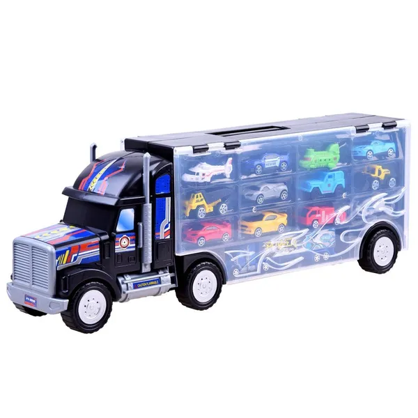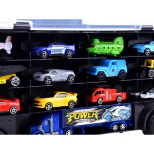 Ki mondta, hogy az autógyűjteménynek szétszórva kell hevernie a szobában? A 57 cm hosszú, hatkerekű játék szállító kamion segítségével a gyerekek egyszerre rendszerezhetik és mozgathatják kedvenc járgányaikat. A műanyagból készült kamion felnyitható pótkocsijában rekeszek találhatók, amelyek megóvják az autókat a karcolódástól, a tetőn lévő hordfogantyú pedig megkönnyíti a szállítást.
