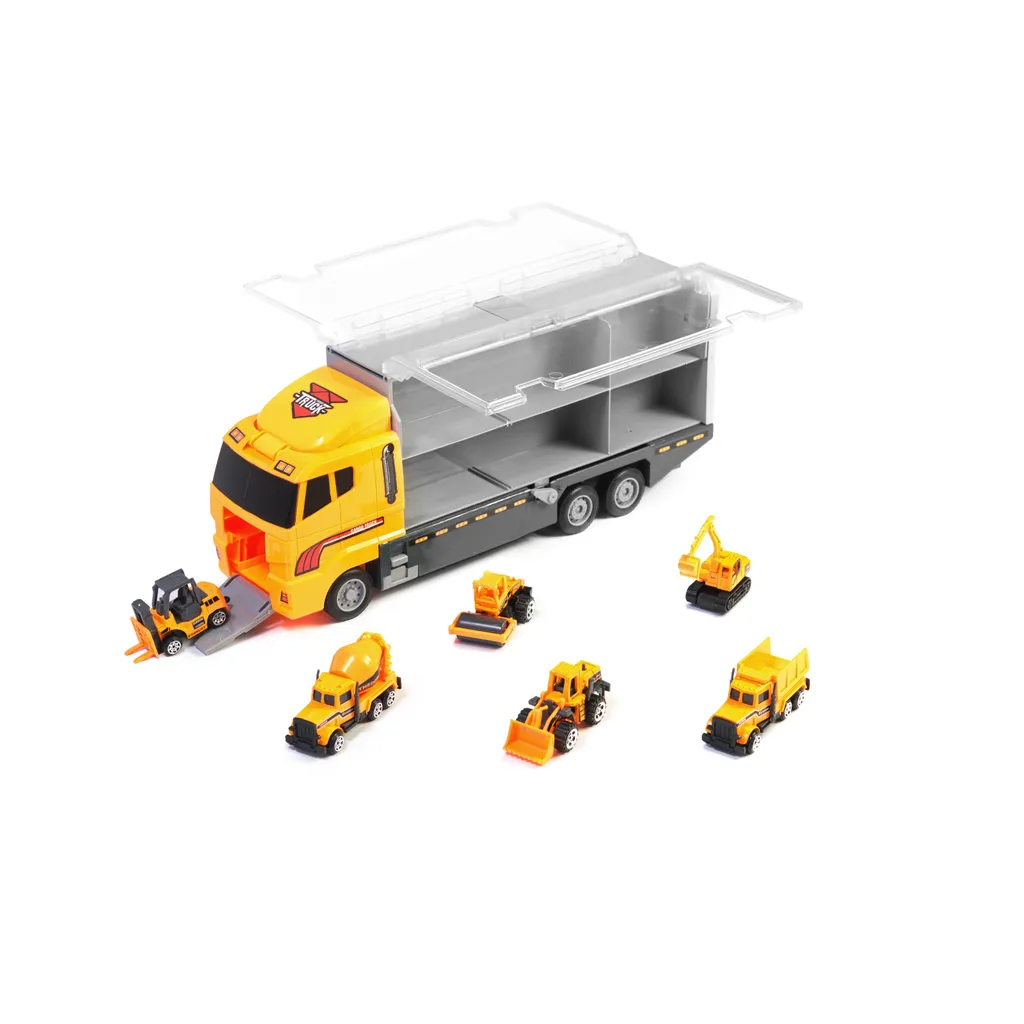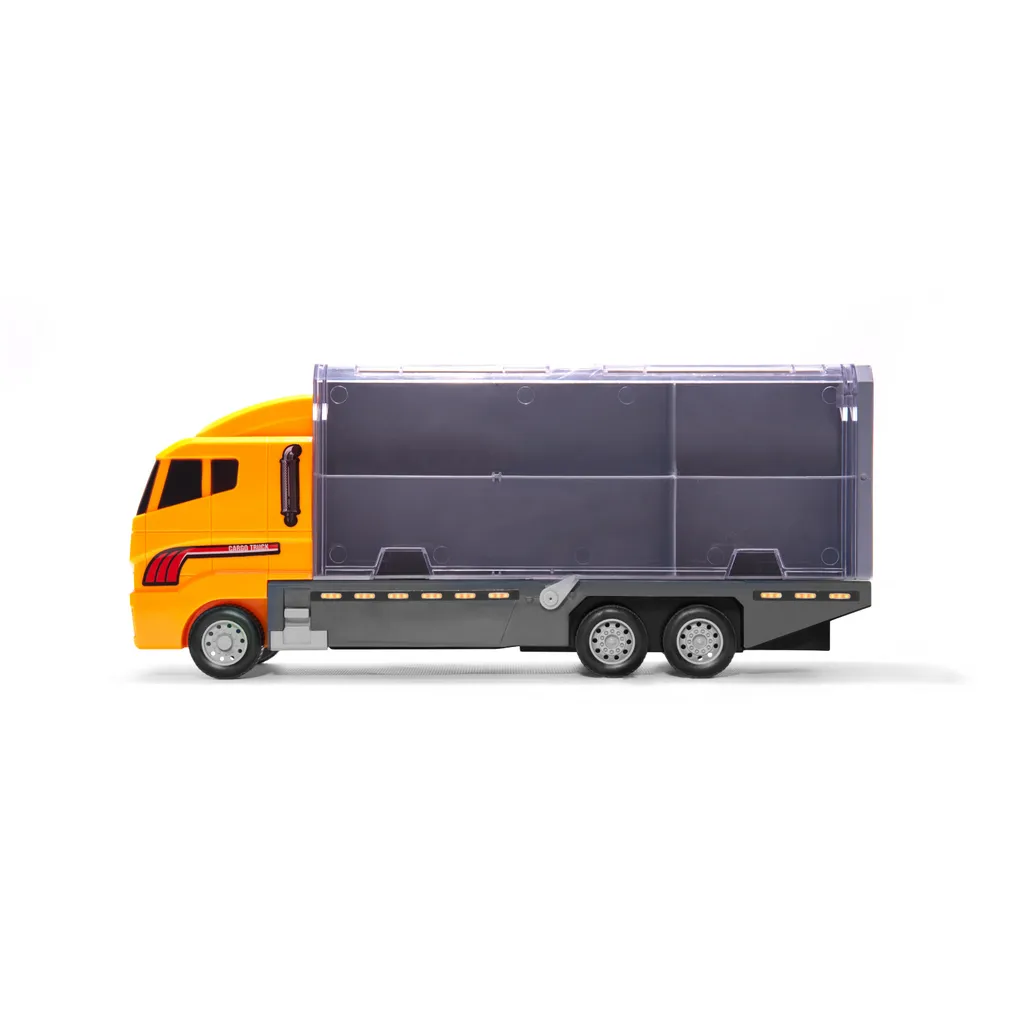 Egy nagy teherautó, amely lehetővé teszi a hozzá tartozó kisautók biztonságos szállítását.