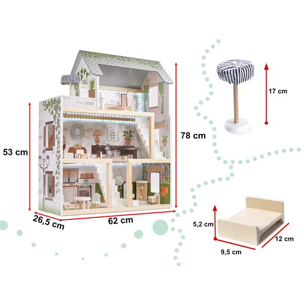 Háromszintes, LED-világítású fa babaház, amely a gazdagon felszerelt szobákkal és boho dizájnnal órákra leköti a fantáziát. A simára csiszolt elemek biztonságosak, a letisztult színek pedig stílusos díszként is szolgálnak.